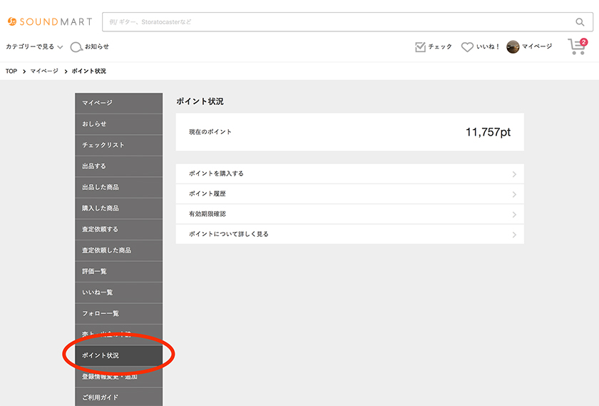 - 必要なポイント数を入力すると、1pt=1円で売上金をポイントに交換することができます。交換したポイントはサウンドマート内のお買い物にご利用いただけます。