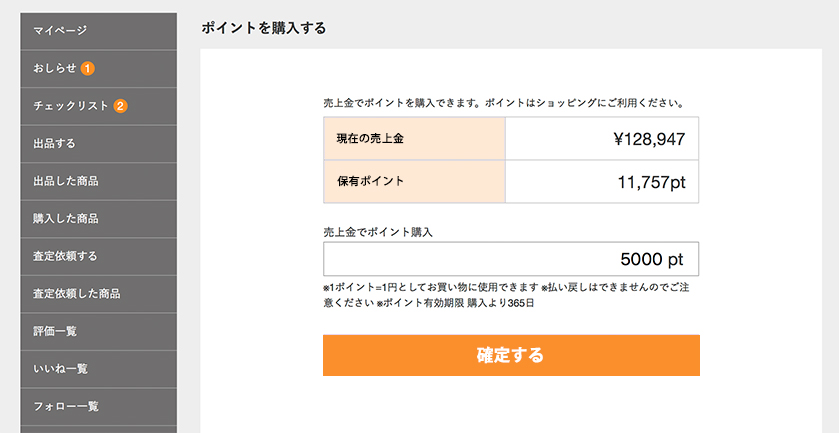 - 「ポイントに交換する」を選び、売上金を確認しながら、必要なポイント数を入力し、「確定する」を押してください。