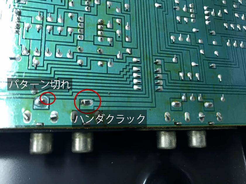 今回の症状である「スルーアウトが出力されない」ということですが、表から見た感じは目に見える問題なし。コンデンサも膨らんではおらず、スイッチパーツも正常に切り替わっている様子。「マイコンかなぁ~。」と最悪のケースを想定しながらも、物理的な軽度の原因である希望を捨てずに裏面をチェック。するとスルーアウト端子付近で見事に両チャンネルとも接触不良を発見!!