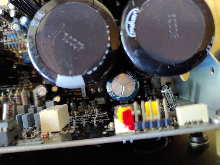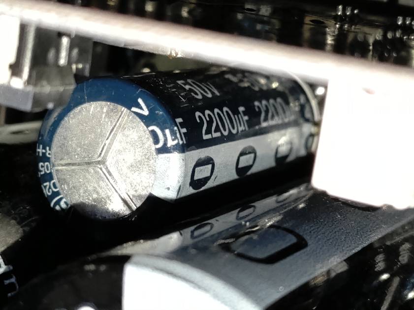 電源回路周りを観察していると、ご懐妊電解コン発見。おそらくコレでしょうかね。