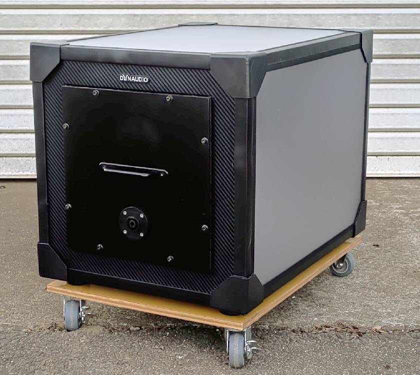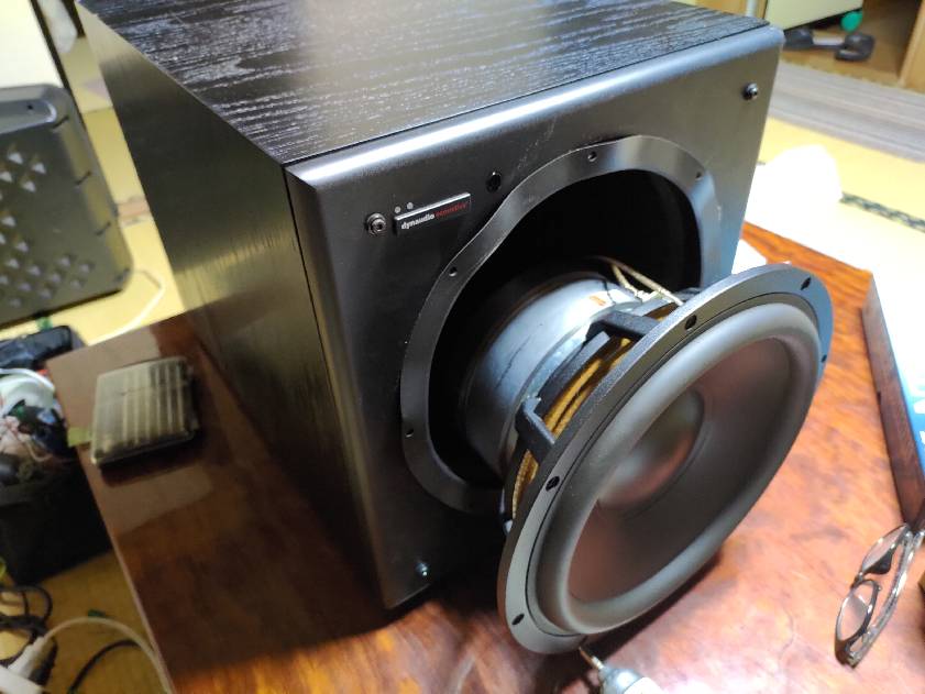 どこかのプロダクションで使用されていた、Dynaudio社製アクティブサブウーファ「BM12S」。音が出なくなったとのことで廃棄される寸前のところで引き取りました。