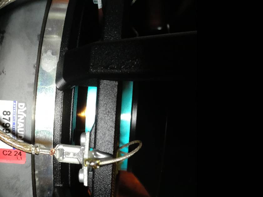 背面のアンプ側とは遮られていて、リモコン受光部用のフラットケーブルと+-が通されて封じられていました。