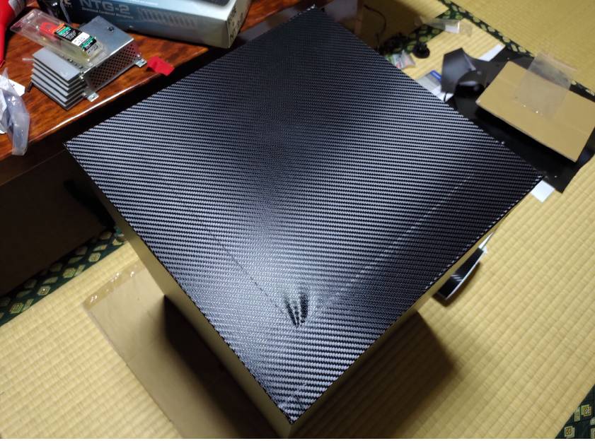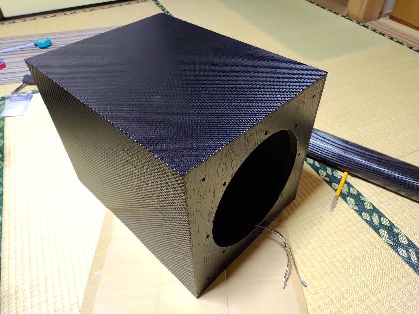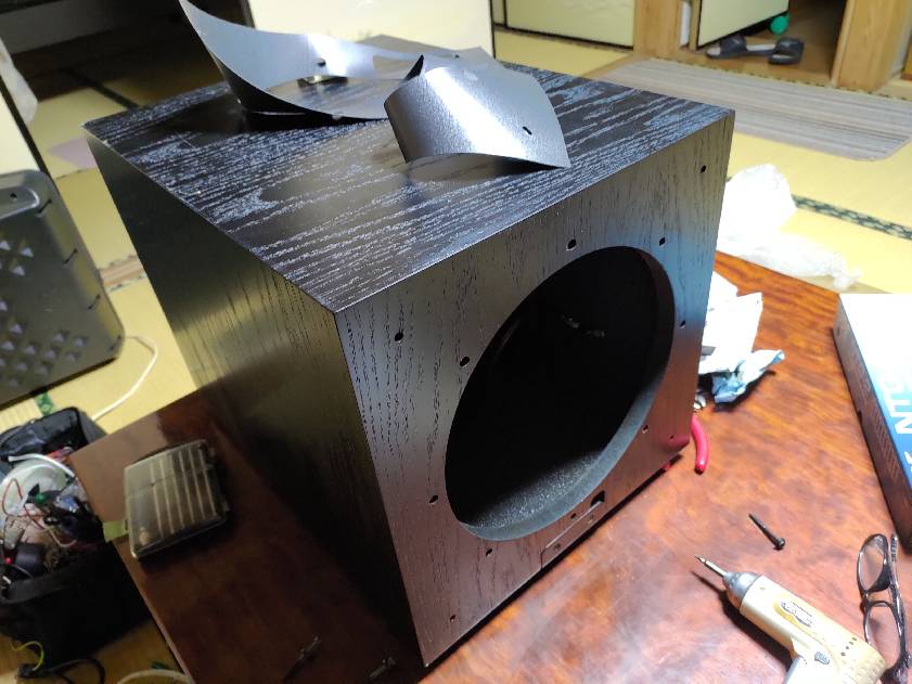 まずは傷だらけだったエンクロージャにアストロプロダクツのカーボン調シートを貼りました。