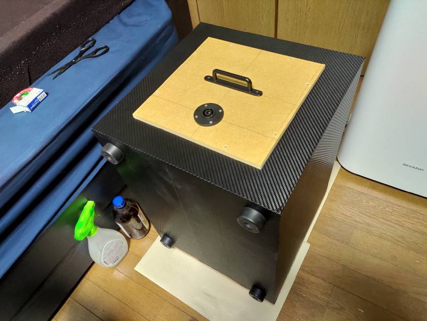 本体ボックスへ仮置き。運搬用の取手も取り付けました。