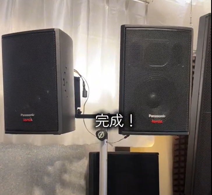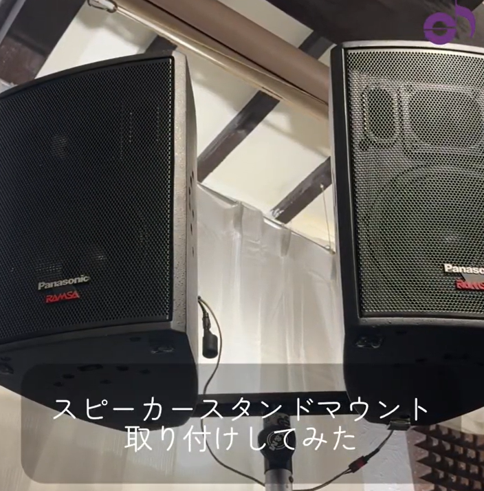 無事に取り付けて完成です!!このマウントアダプターはスピーカー背面に取り付けるタイプなので、重量の軽い8インチ程度(1本の重量が重量10kg)程度のスピーカーにベストマッチでした。