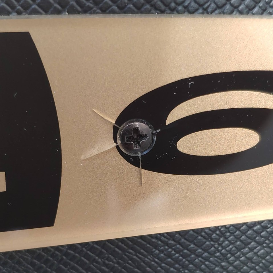 商品について一点だけ、キャビネットのブランドロゴ、ネジ締め周辺箇所に