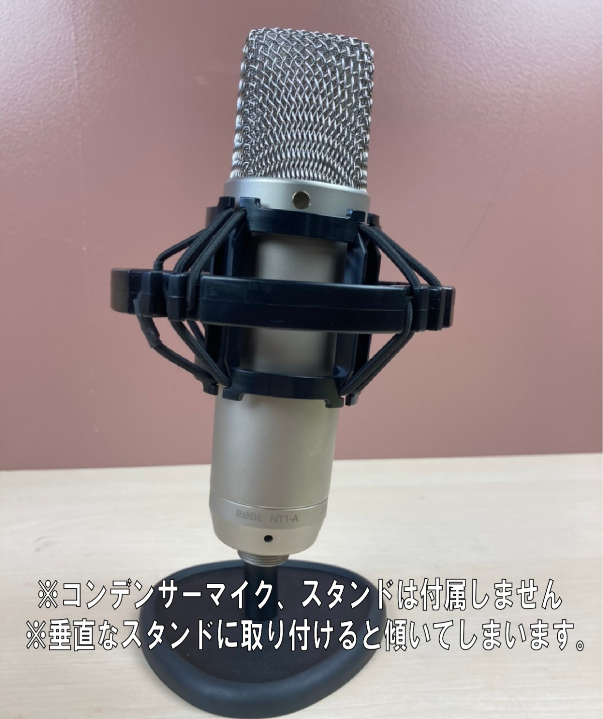 ※装着例の画像の様に、垂直にしか装着できないマイクスタンドの場合は、構造上の問題で若干右に傾いてしまいます。気になる方はグースネックタイプのスタンドに取り付けると良いかもしれません。