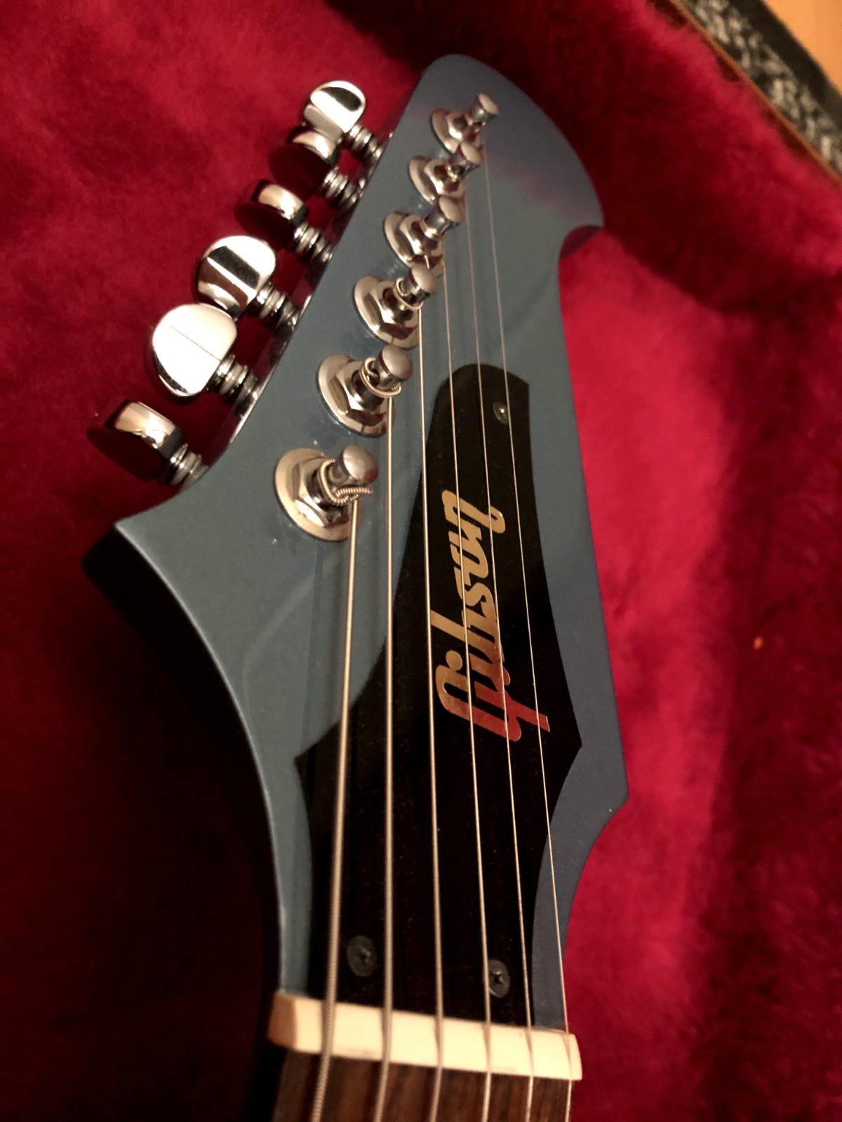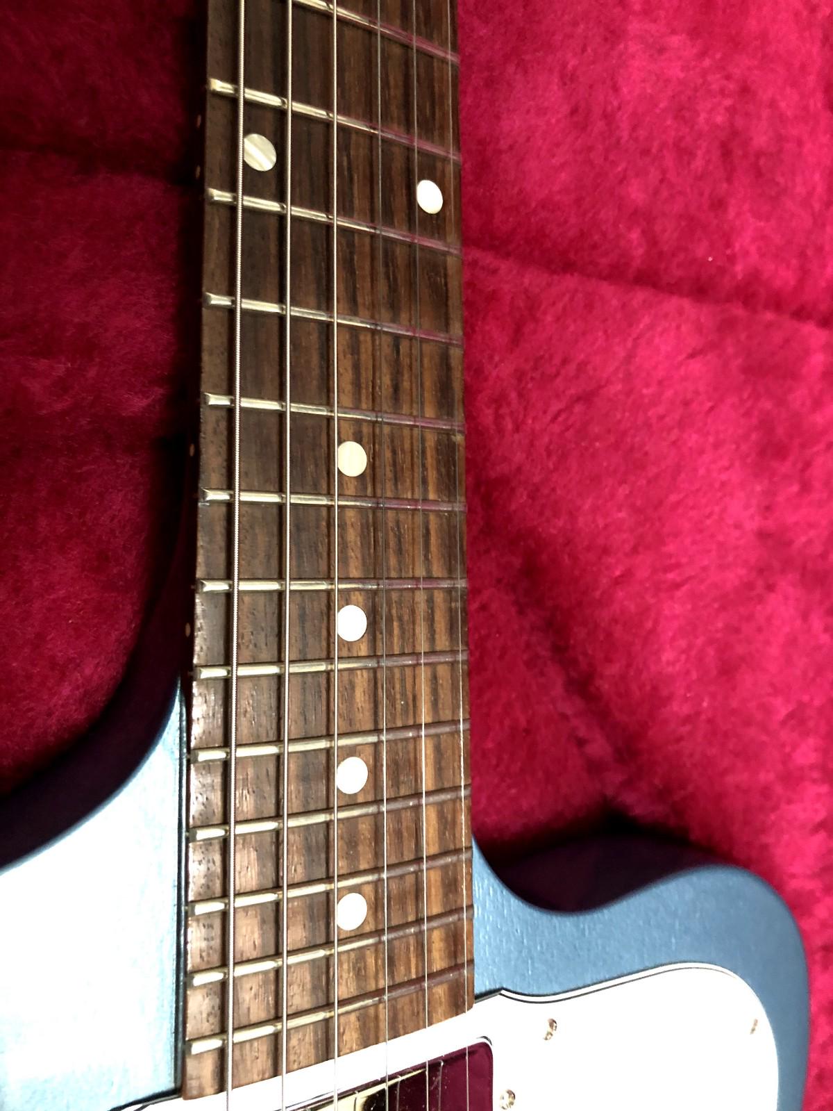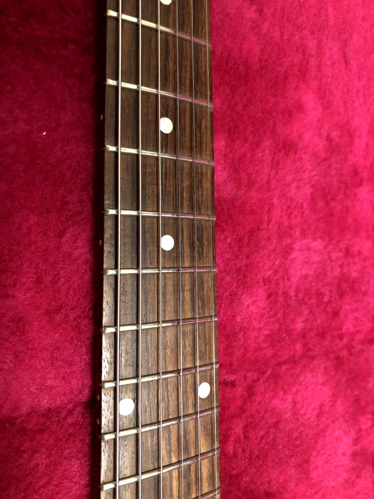 ピックガード・背面のポッドキャビティカバーには通常の使用でつく程度のすり傷、ボディ背面にも細かな線キズがあります。ネックの状態は良好で、フレットも9割残っています。