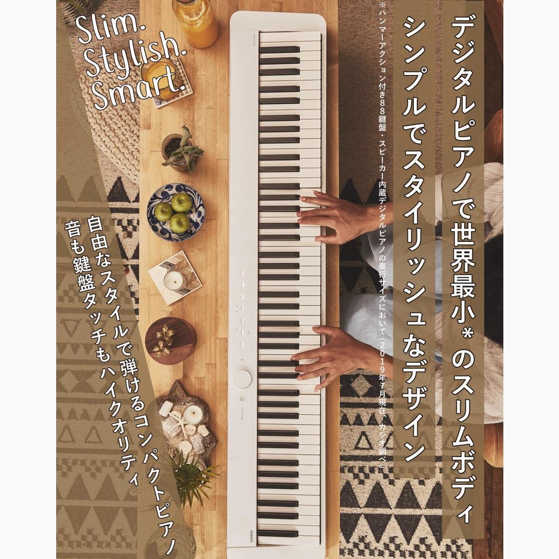 ハンマーアクション付き鍵盤搭載のデジタルピアノで世界最小※のスリムボディ、シンプルでスタイリッシュなデザイン ※88ハンマーアクション鍵盤・スピーカー搭載デジタルピアノの奥行きサイズにおいて。(2019年1月現在、カシオ調べ)