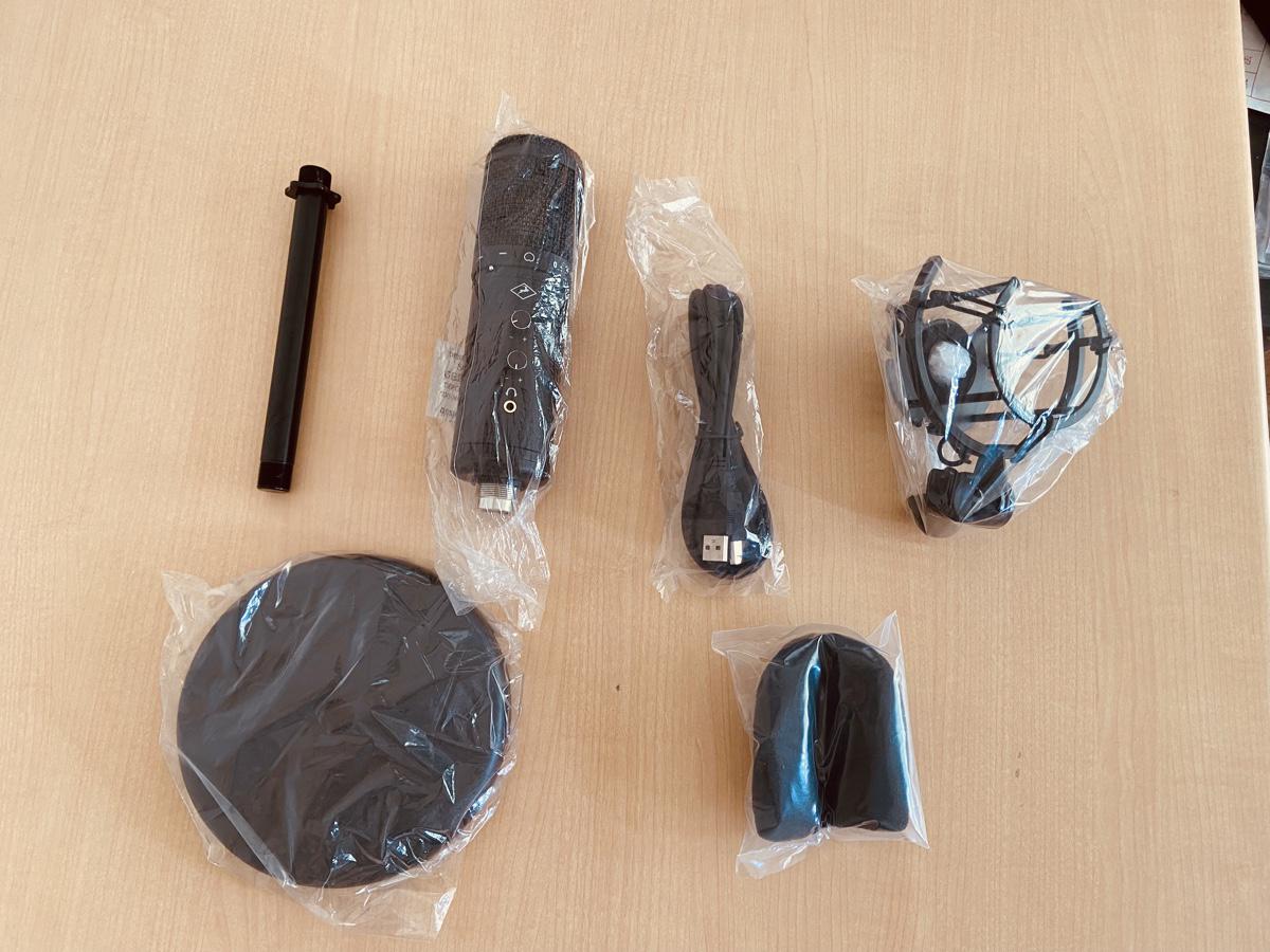 ・パッケージと付属品(USBケーブル・卓上スタンド・ポップガード・ショックマウント・保証書)すべて揃っています。