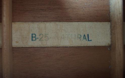 バック材のマホガニーについて、私が見た限りで確信はありませんが、貼り合わせではなく1枚板のようです。角度を変えたりして見ても、中央部分に張り合わせた痕跡がありません。指盤のハカランダも稀少材で、個人的には、今では制作不可能なB-25と考えています。