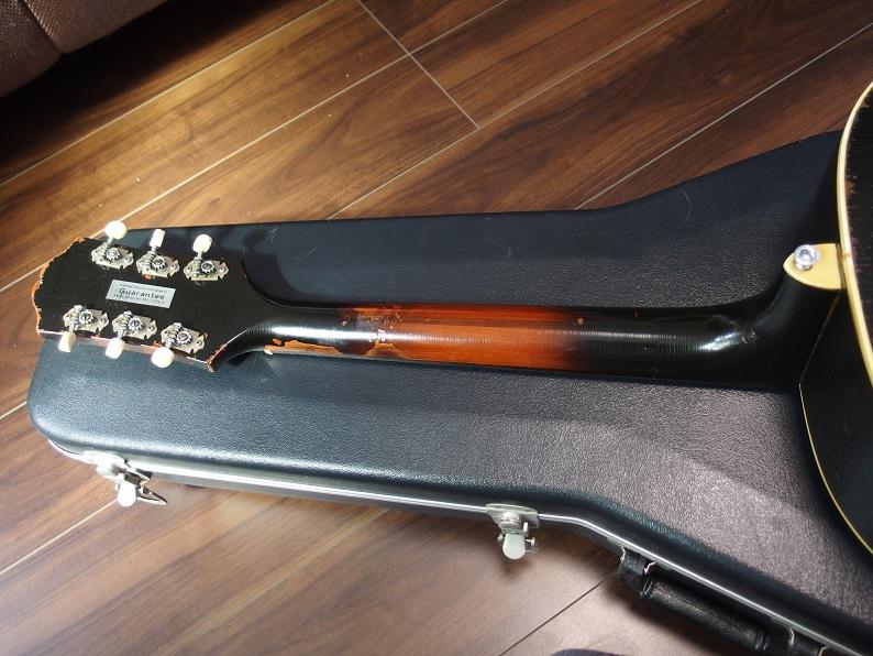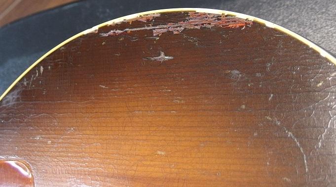 パーツなどは、わたしが購入した時の状態ですが、ネックヒールにストラップピンを付けてあります。リペアに関しては、ボディ全体にオーヴァーラッカーを1回、バインディング補修、トップクラック補修、などです。写真に撮っておきましたが、ボディ下側に割れを補修した跡があります。これは買った時からです。
