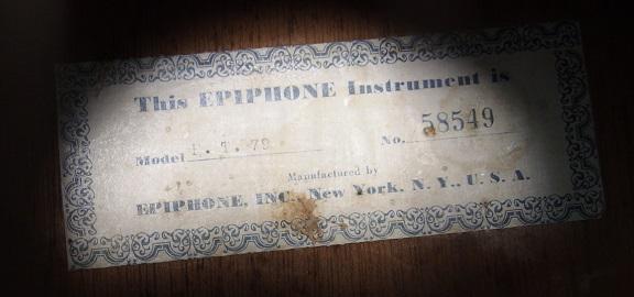 もともと「エピフォン」は、ニューヨークでギターを制作していましたが、1957年にギブソンがレーベルを買取り、吸収します。それ以降はギブソンの別レーベルのような形で販売されるようになりました。今では、オリジナルのエピフォンは「ニューヨークエピフォン」と呼ばれ、品質の高さから、かなりプレミアが付き高値で取引されているようです。ボディ内のラベルに「NewYork」とあるので、すぐに見分けられます。ちなみに、ギブソンメイドのものは「Kalamazoo」と生産地がラベルに記されています。特に初期エピフォンのアーチトップギターは、非常に高価です。出品したニューヨークエピフォンギターはフラットトップですが、バックはアーチとなっており、おそらくカントリーやフォークなどのムーヴメントに合わせて、トップだけをアーチからフラットに変更して1950年代中頃に制作されたものと思われます。