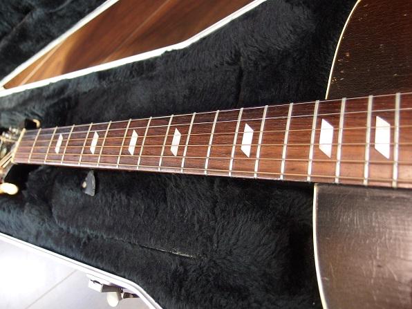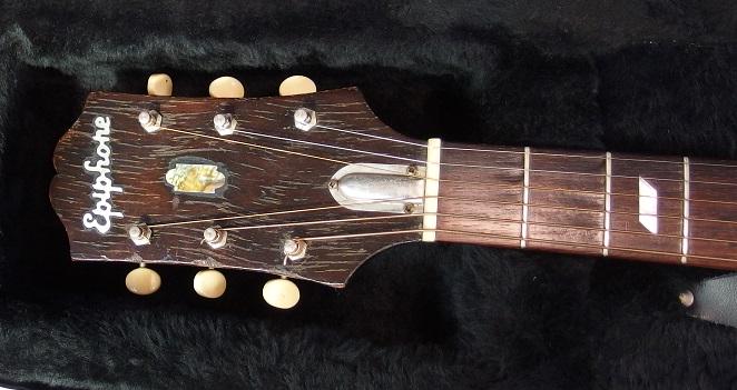 以下は、わたしが測ったスペック。ボディ・トップはスプルースで、ブックマッチ(貼り合わせ)ではなく1枚板。バックは、おそらくマホガニーで、こちらも1枚板削り出し。サイドは、マホガニーに見えますが確信はありません。ネック材はエピフォン伝統の3ピース材で、メイプルをマホガニーでサンドイッチにしたように見えますが、こちらも使用材の確信はありません。指盤はローズウッド。ナット幅43.8mmほどで、太めのグリップです。スケール(弦長)は、25.5インチ(約648mm)。弦高は12フレット上で、6弦2.2mm、1弦1.9mmほど。ネックは、現状ストレートで、安心して弾けます。フレットは、わたしが買う前に一度軽く摺り合わせたように感じますが、十分に残っています。ペグはオリジナルのようで、かなり古そうですが、今のところ使用上の問題はありません。ボディは16インチで、厚み(深さ)は140mm程あります。体の小さい方は、弾くのにやや難があるかもしれません。そのボディ厚のために普通のケースでは入らないので、SKBハードケースの底の発泡スチロールを少し自分で削って加工しました。オリジナルのケースは薄い紙ケースで劣化も激しかったので、すでに処分しました。