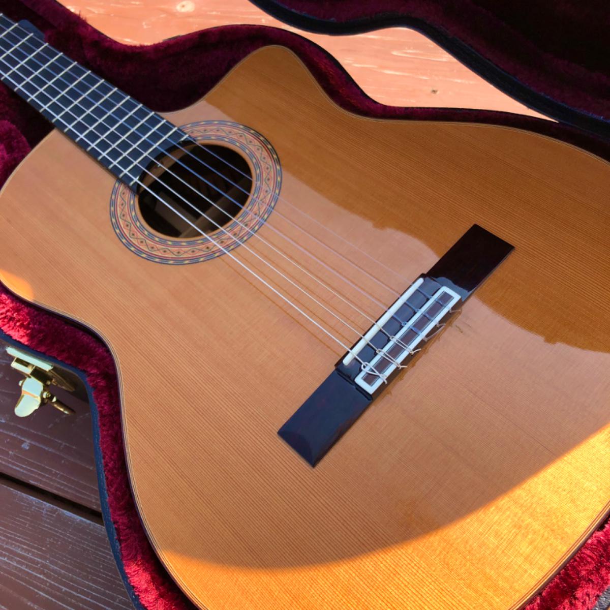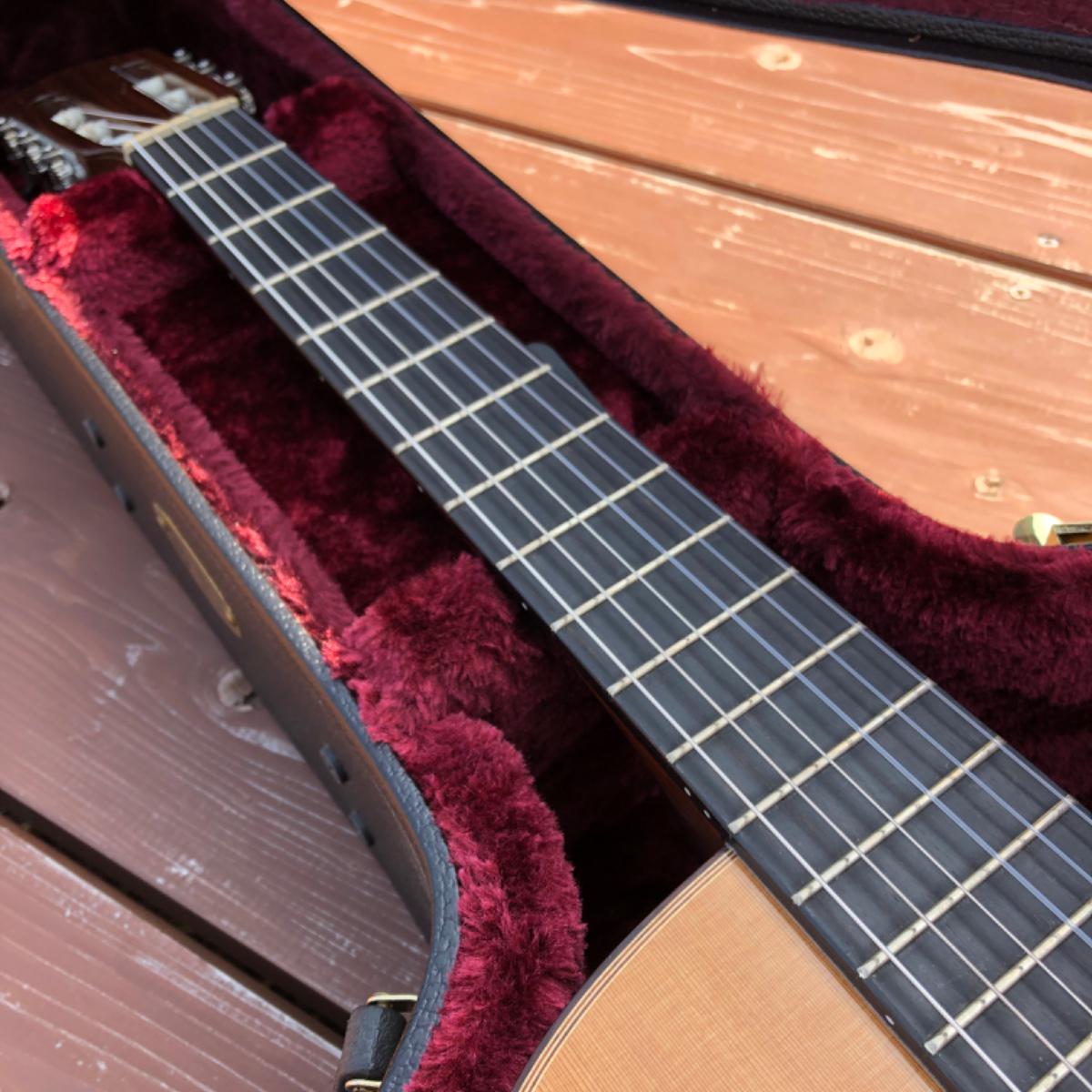 珍しく、クラシックギターにありがちなボディの膨れは全くなく、真っ平ら