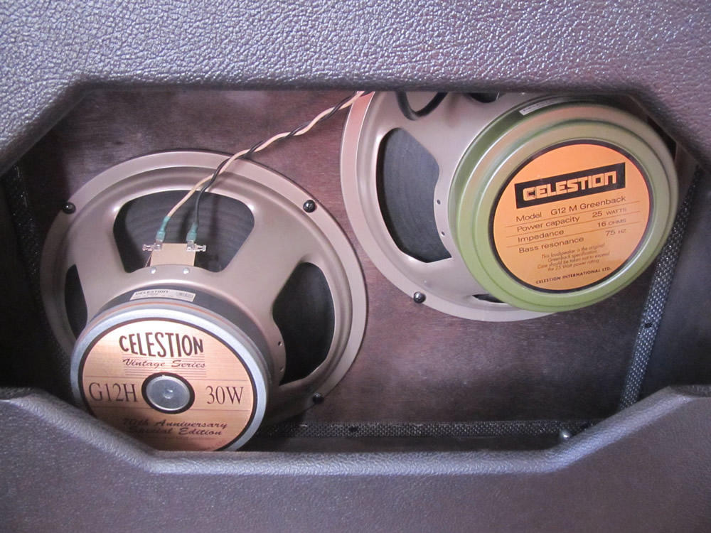 画像ではコンパクトに見えますが、CELESTION製のそれぞれ種類の異なる12インチスピーカーが2発入っており、それなりに大型のアンプになります。