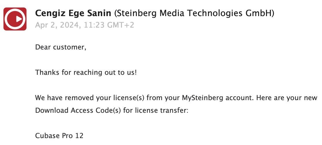 新しいダウンロードアクセスコードは取得済ですので、購入後すぐにお伝えできます。(メール画像をご確認ください。私のライセンスが消去され、ライセンス譲渡用に新しいコードが発行されたという内容です。)