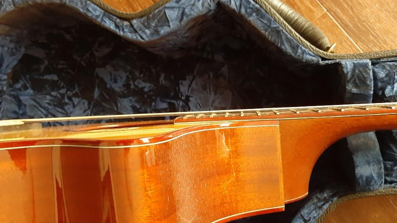 写真では透明なゴルペ板が貼られてますが一部削れていたのと鳴りの妨げになるので当方で綺麗に剥がしました。