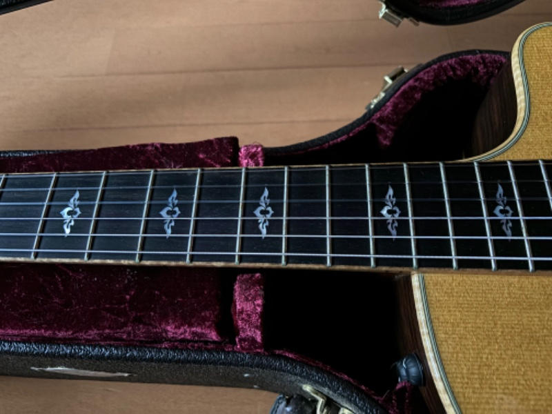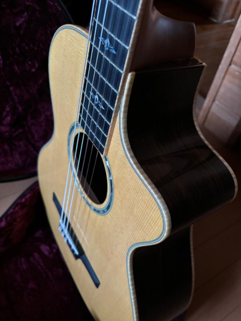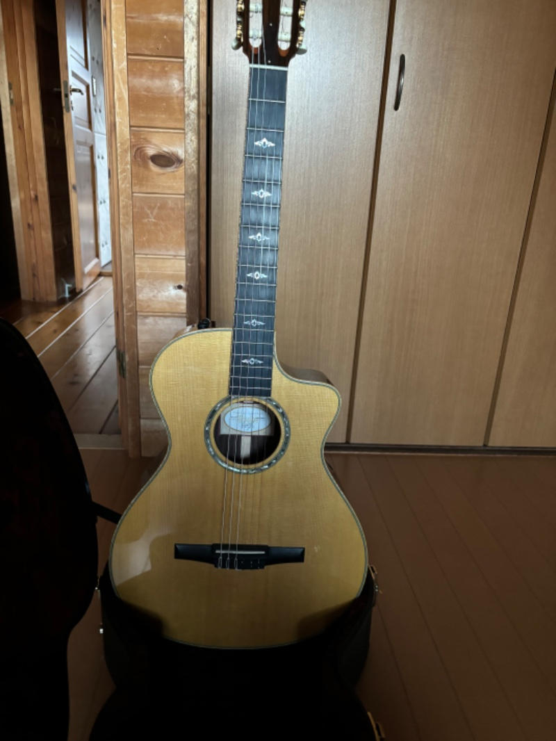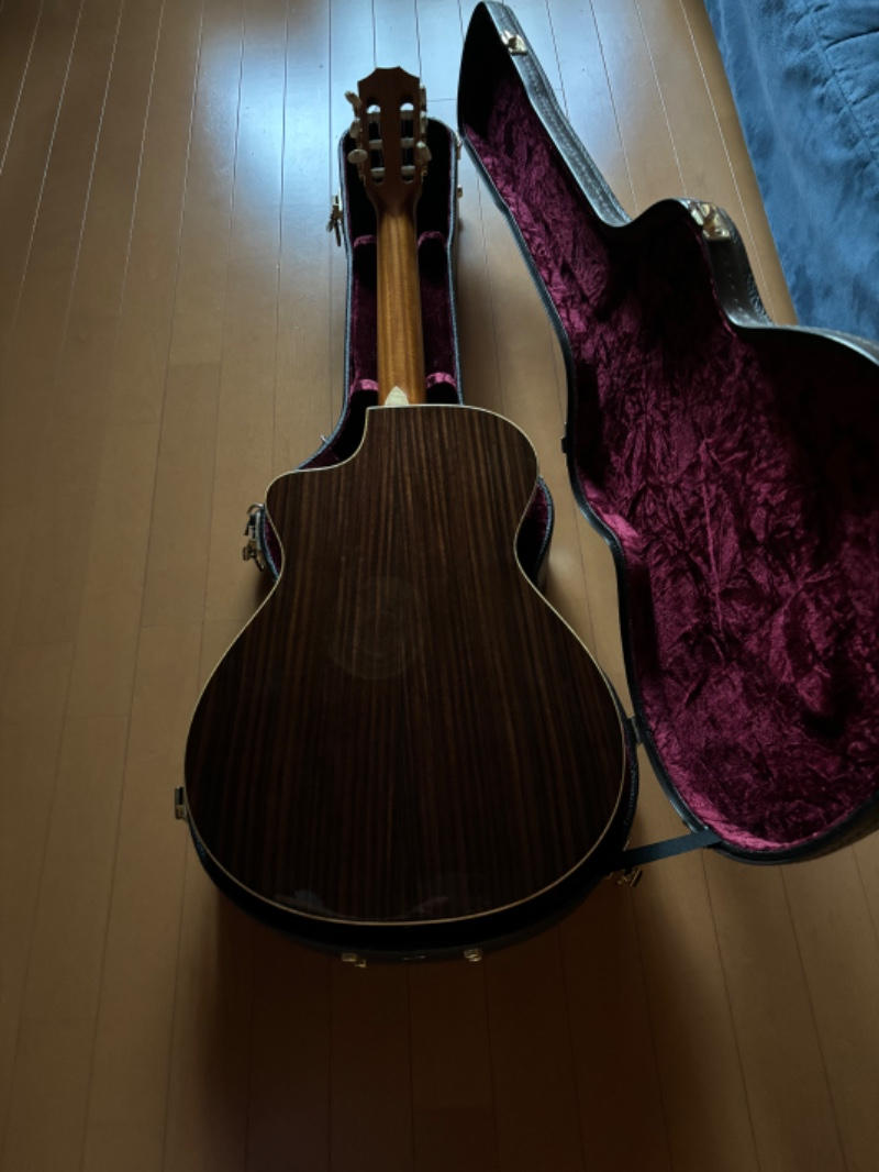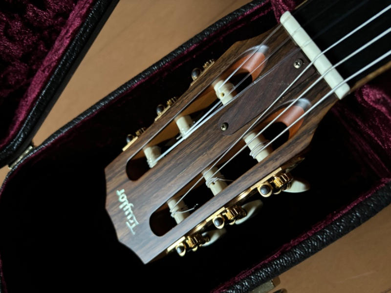 シトカスプルーストップ、インディアンローズウッドサイド/バック、トロピカルマホガニーネック、スモーキーエボニー指板、エボニーブリッジ、オリジナルニッケルペグ、”エレメント”パール指板インレイ、アバロン&ウッドロゼッタ、メイプルバインディング、ES-Nピックアップ搭載。テイラーラインナップの中で小ぶりでコンパクトなサイズ感のボディシェイプ。そのサイズ感からは想像のつかない豊かな低域、クリアな高域、そして全くブレない芯のある響き。トラディショナルなクラシックサウンドと薄型ネックシェイプ、僅かにRのついた指板などモダンなプレイアビリティをバランスよく兼ね備えた使い勝手の良いエレガットモデルです。ナイロン弦の響きを最大限にアウトプットするES-N。コントローラーはVol,Treble,Bassとシンプルな構成ながら十分な調整幅を持ち、好みのサウンドセッティング可能なパフォーマンス力の高いシステムです。光の加減でわかるような僅かなクロスキズがある程度と使用感極薄の美品です。美しい光沢のグロスフィニッシュにアバロンロゼッタ、締まりのあるメイプルバインディングなど高級感あふれるルックス。様々なプレイスタイルに対応してくれるオールマイティなモデルです。アコギやエレキからの持ち替えでエレガットをご検討中の方は是非お試しいただきたい1本です。オリジナルハードケースが付属します。