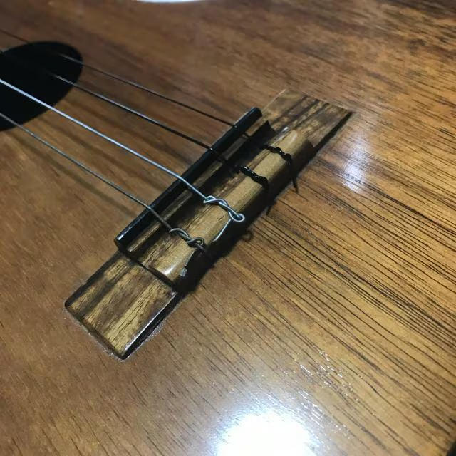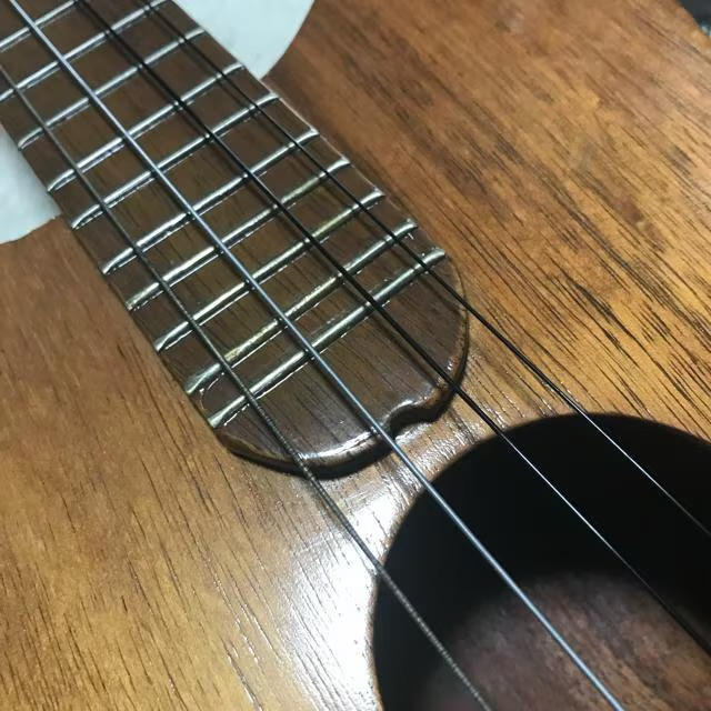 現在スチール弦が張られていますが、ナイロン弦もAquilaのAQ-B4 23Uならレギュラーチューニングで弾けます。