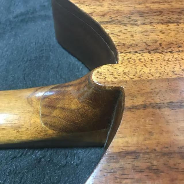 正面から見て左肩にクラック(下手なリペア済)、ブリッジ1弦下にクラックらしき筋、両クビレ上側にクラック跡、フレットとボディ接合部にスキマが有ります。
