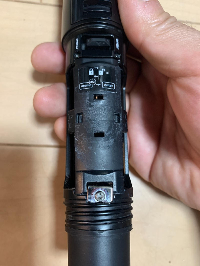 表面は中古としてはなかなか綺麗な状態ですが、よくみると使用感はございますのでご了承ください。一番顕著な例では単三電池を入れるプラスチックの蓋が白くなっていたりします(写真参照)。