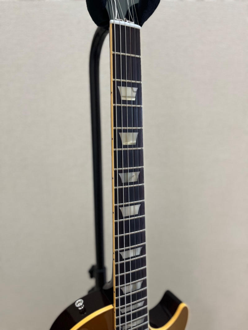 ●V2ネックは日本で人気の高い59ネックより1mm少々薄い感触でローからハイポジまで全体的に均一な薄さと感じます。ネック全体の丸みが細いのではなくネック背面の頂点を削った「Uシェイプ」に近く「ラクに握り込めるけどレスポールらしい感触」があります。