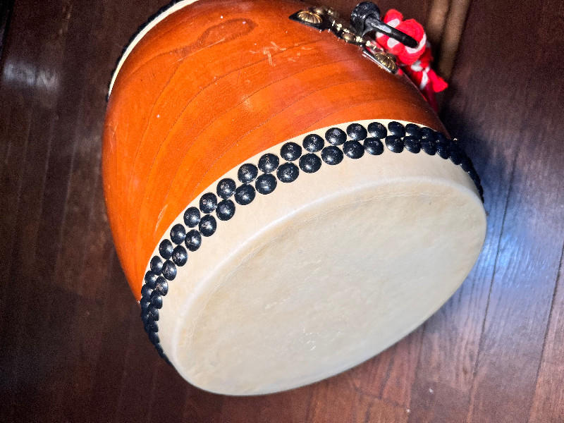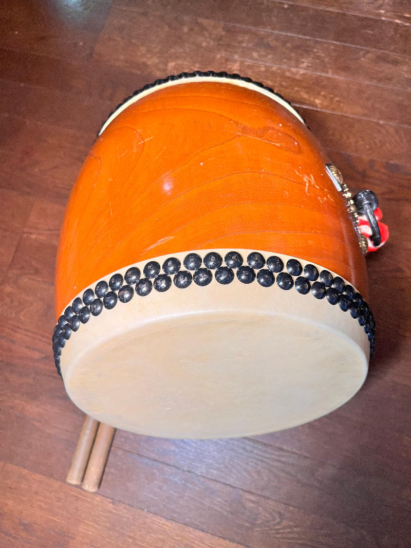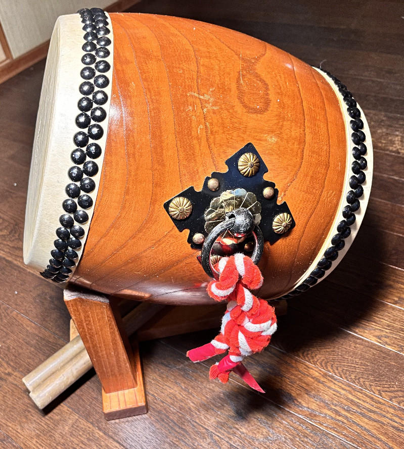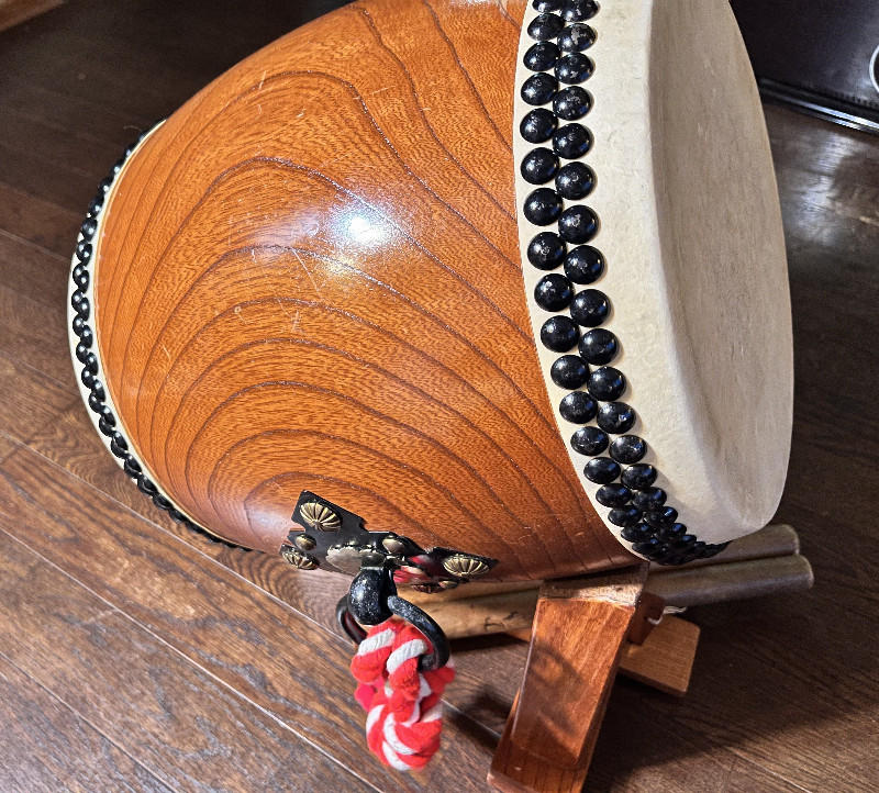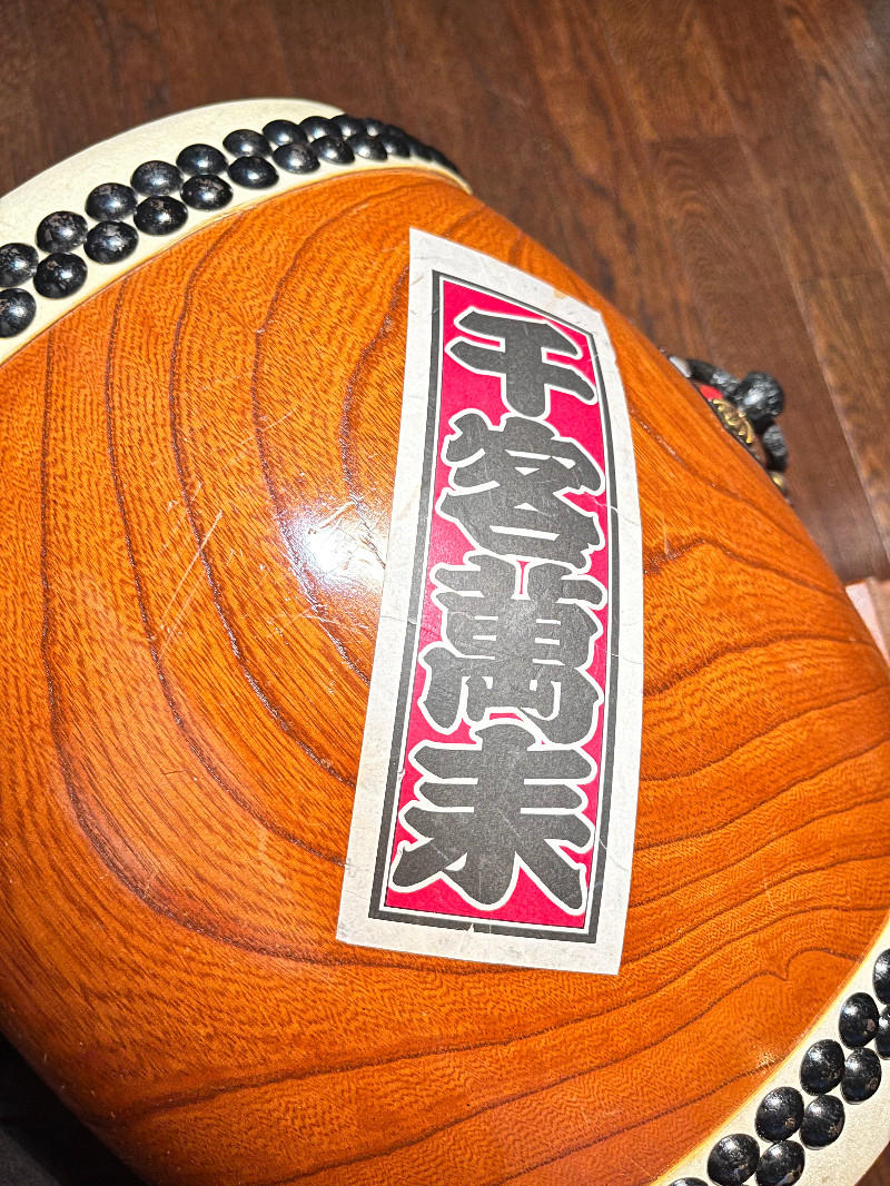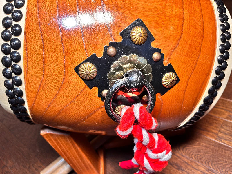 こちらの和太鼓は、杉浦太鼓店で特注の長胴太鼓です。木目が美しい国産ケヤキ胴に、良質な国産牛皮を使用したこだわりの逸品です。