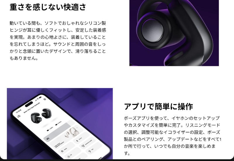 革新的なオープンイヤーデザイン、驚きの音質、一日中快適な装着感。Ultra Open Earbudsはイヤホンの概念を変えるサウンドウェアです。耳を塞がないカフ型にOpenAudioテクノロジーを搭載。周囲の音を聞きながら、豊かで深みのあるプライベートサウンドを楽しめます。