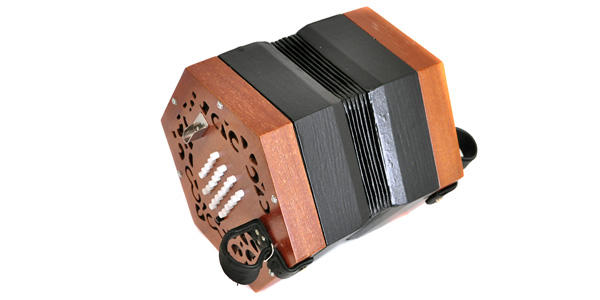 両サイドのボタンを押しながら両手で蛇腹を押したり引いたりすることで音を出す楽器です。アコーディオンと似ていますが、左右対称なデザインがアコーディオンと異なる特徴です。小型ですが旋律も和音伴奏も可能。世界各地の民族音楽で広く使われる楽器です。