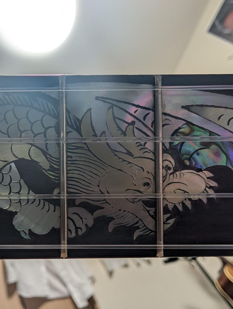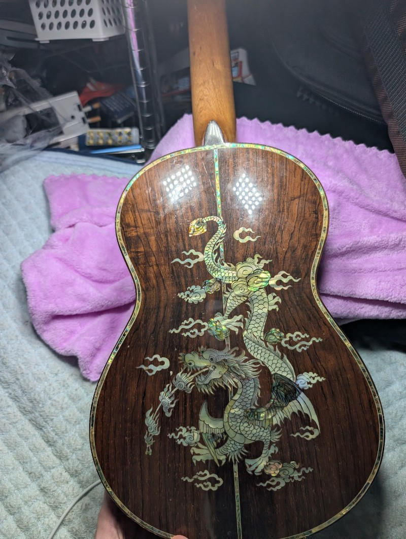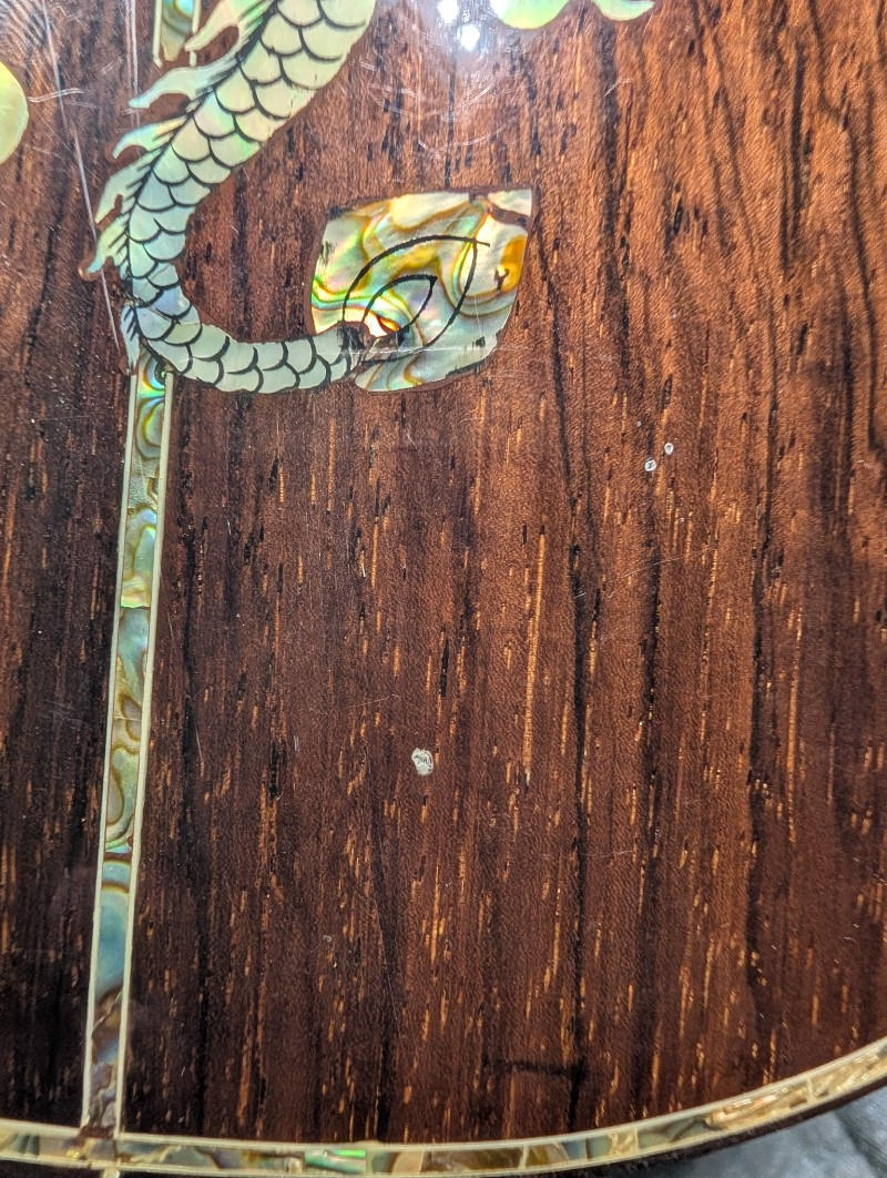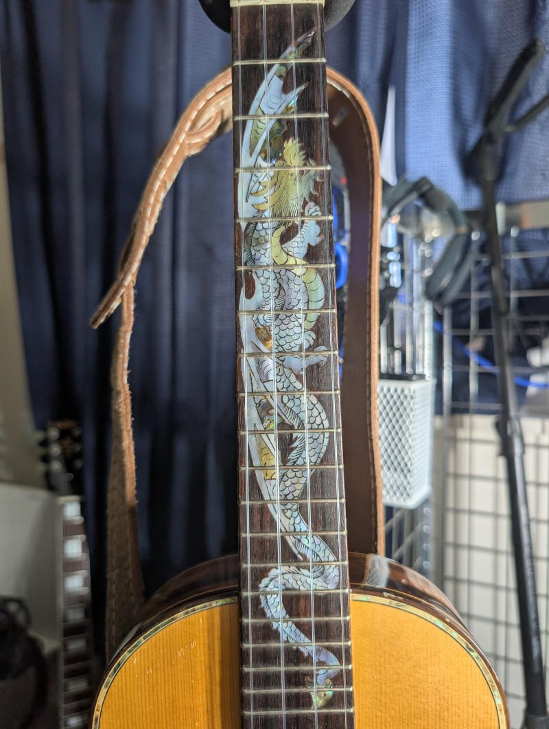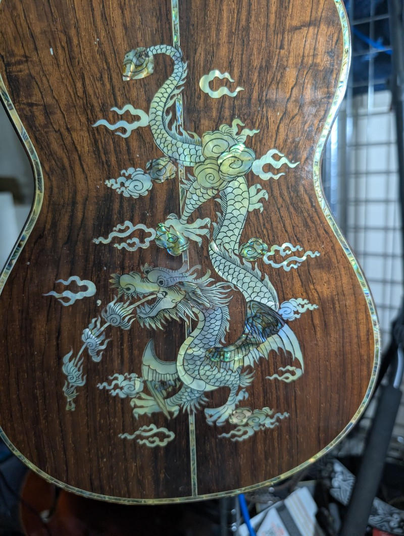 圧巻のインレイワーク: 2種類のシェル(白蝶貝・アバロン等)を緻密に使い分け、立体的に表現された「龍」のインレイが施されています。ヘッドの「バラ」のインレイを含め、アントニオ・ツァイ氏黄金期の仕事であることを示唆しています。