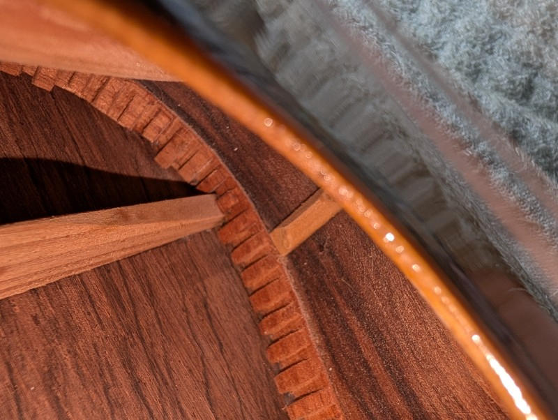 ボディ内部に割れ止めや内部の杢目と外側の杢目柄の一致からオール単板であることは、ほぼ確実です。
