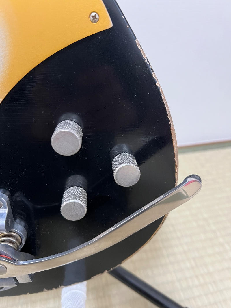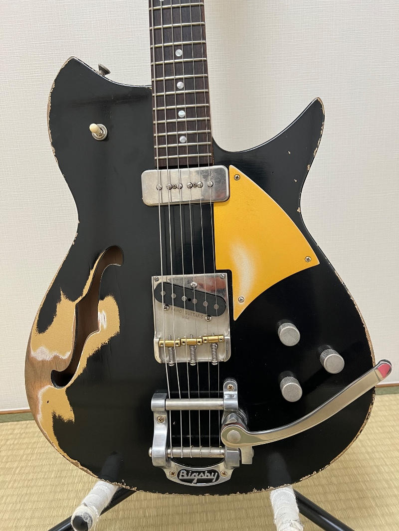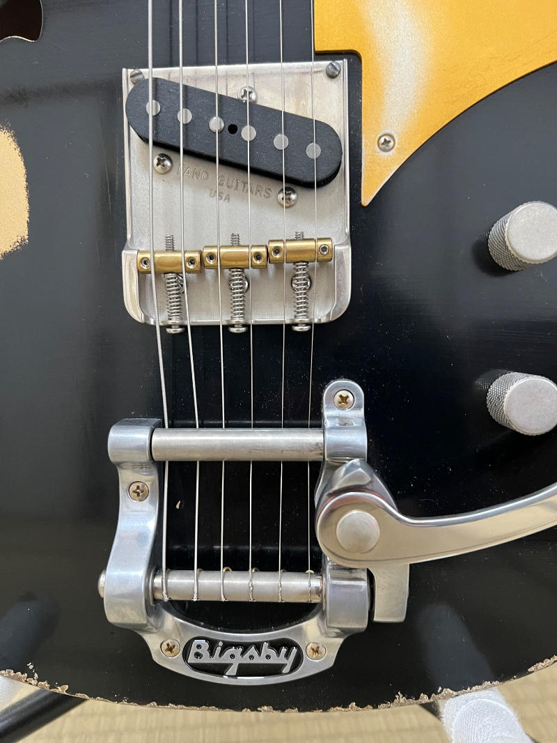 リンディフレーリンのピックアップ、ビグスビー、テレブリッジ仕様、ブラックとゴールドのマルチレイヤーカラー、別途注文した純正ハードケースと超豪華仕様で、新品価格は98万円ほどです。